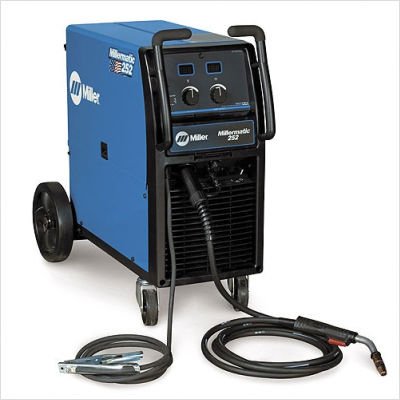 Miller Electric # 951066 Millermatic 252 Mig Welder with Spoolmatic 30A Spoolgun 33LB .035" 70S-6 SPOOL MILD STEEL WIRE INCLUDED. Highest output in its class (250 A at 28 VDC). Weld longer on high end applications.New! Large, digital front panel with built-in digital timers menu enables operator to preset voltage and wire feed speed. Standard run-in, pre/postflow, burnback, spot/delay (stitch) timer menu.New! Auto Gun Detect allows operator to simply pull trigger on MIG gun, spool gun, or push/pull gun. Automatically detects and recalls the voltage, wire feed speed, and timer of the active gun.New! Push-Pull Gun Direct Connect - now directly connects your push-pull gun, no extra module required. New! Angled, dual-gear driven, cast aluminum drive system features no-tool, quick-change reversible drive rolls and an easy-to-set, scaled tension knob. New! Patent-pending EZ-Change Low Cylinder Rack allows operators to easily roll cylinders on and off of rack - no need to lift cylinders.New! EZ-Access Consumable Compartment and Parameter Chart - set weld parameters right the first time with convenient new flip-down compartment that provides fast access to parameter chart and consumables.New! Larger work area - now with longer 15-ft M-25 gun. Less weld cleanup with Active Arc Stabilizer pateneted Miller design provides excellent starts proven superior to the competition.Fan-On-Demand coooling system operates only when needed reducing power consumption and contaminants drawn into the machine.Line voltage compensation keeps power constant even if input voltages varies by 10%. ProcessMIG (GMAW) Flux Cored (FCAW) SpecificationsInput PowerRequires 1- phase power Rated Output200 Amps at 28 VDC, 60% duty cycle 250 Amps at 28 VDC, 40% duty cycle Welding Amperage Range30 - 300 Amps Wire Speed 50 - 700 IPM (1.3 - 17.8 m/min) Net Weight207 lb (94 kg)